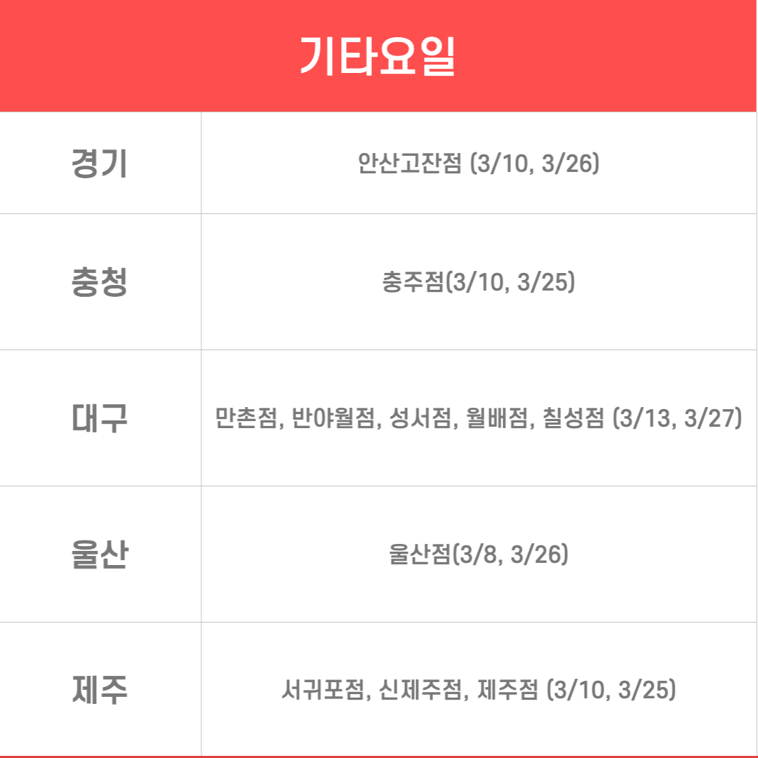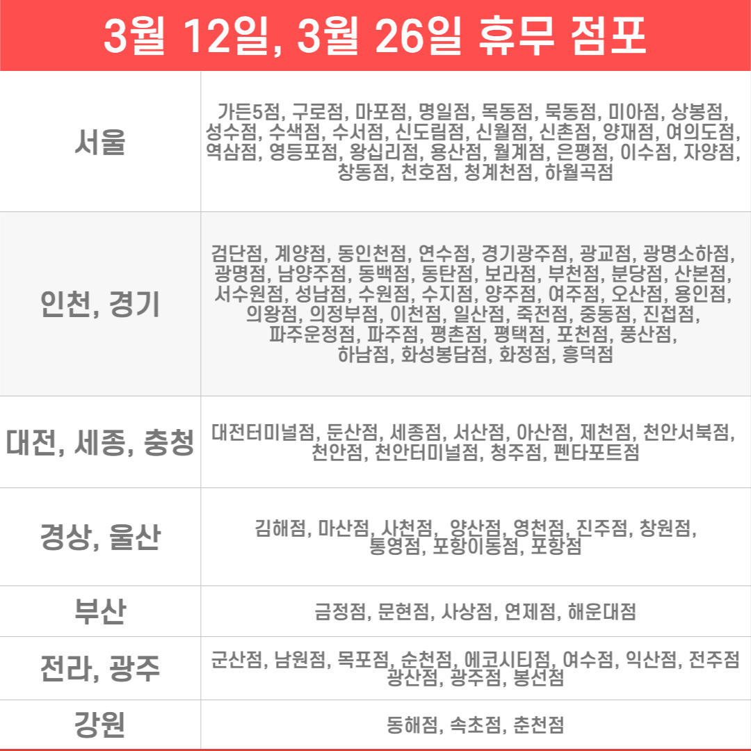 3월 12일 3월 26일 휴무는 전국 108개 점포가 해당됩니다. 서울, 인천은 전 지역이 해당되고, 나머지 지역은 일부 점포마다 다르게 적용되어 있습니다.