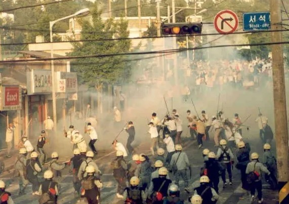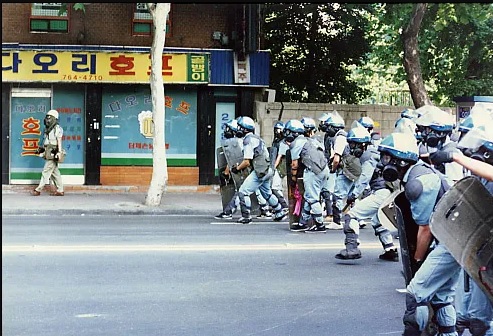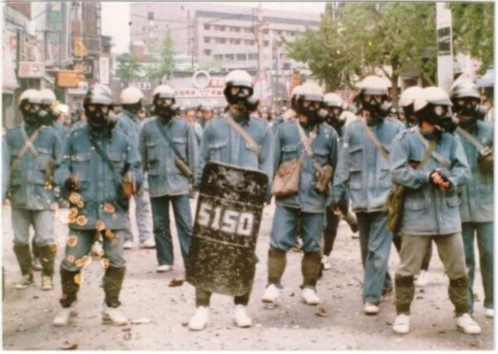 청자켓과 청바지 그리고 헬멧, 방독면을 착용한 백골단은 방패와 곤봉을 소지한채 시위대를 무자비하게 탄압하였습니다.