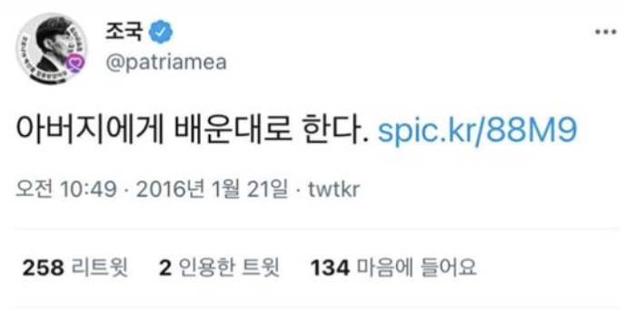 진중권 광운대 특임교수는 조국 전 장관이 박근혜 전 대통령을 저격하여 작성한 글인 '아버지에게 배운 대로 한다'라는 문구를 사용해 조민을 저격하였습니다.