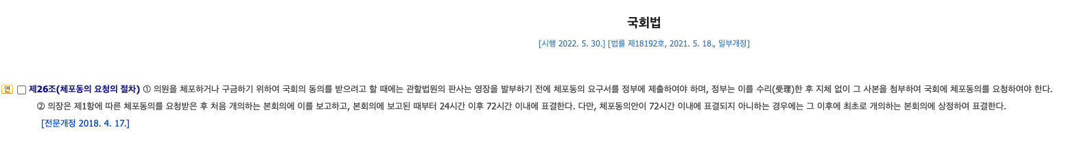 현직 국회의원을 체포하거나 구금하기 위하여 동의안이 통과하여야 합니다.